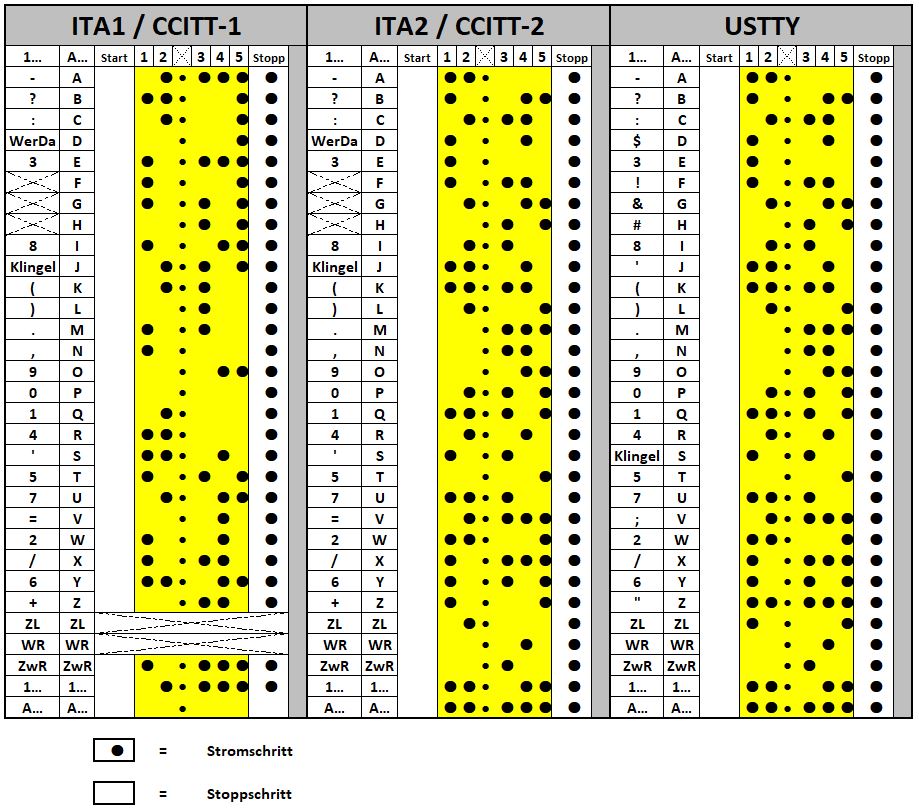 Fernschreiber arbeiten in der Regel mit dem internationalem Telegraphenalphabet Nr.2 (ITA2 / CCITT-2) es gibt auch eine amerikanische Variante, das USTTY und die ältere Variante, das internationale Telegraphenalphabet Nr.1 (ITA1 / CCITT-1)