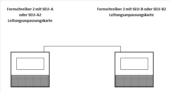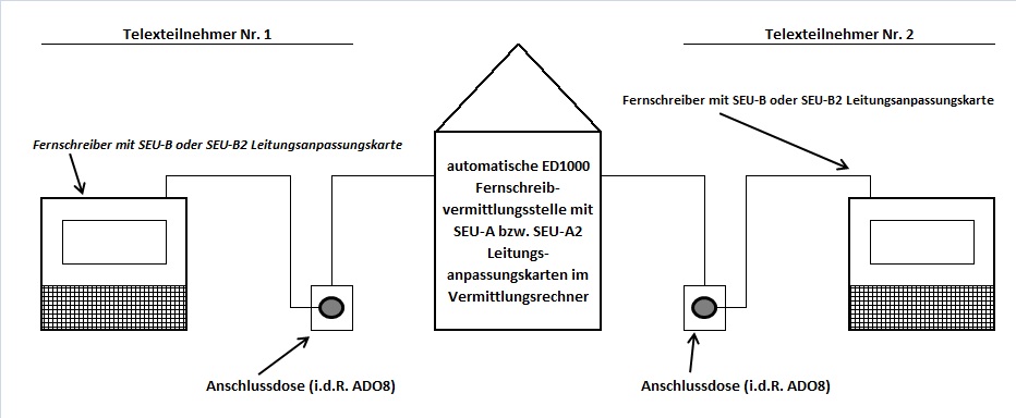 Eine solche Standleitungsverbindung ist auch mit Fernschreibern möglich, welche über Leitungsanpassungskarten aus dem ED1000 Telexnetz verfügen. Dabei muss ein Fernschreiber mit der üblichen Teilnehmerkarte SEU-B oder SEU-B2 ausgerüstet sein und der zweite Fernschreiber muss mit einer SEU-A oder SEU-A2 Karte aus dem Vermittlungsrechner der automatischen Fernschreibvermittlungsstelle ausgerüstet sein. Dann kann man ganz normal die Anruftaste (AT-Taste) drücken um die Verbindung aufzubauen und die Schlusstaste (ST-Taste) um diese wieder zu beenden. Der eine Fernschreiber, welcher mit der SEU-A bzw. SEU-A2 Karte ausgerüstet ist stellt dann sozusagen die Fernschreibvermittlung dar.