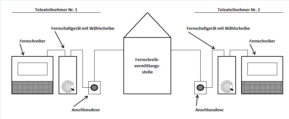 Prinzipskizze für eine Verbindung im ED1000 Fernschreibnetz (gewählt wird über die Tastatur des Fernschreibers):