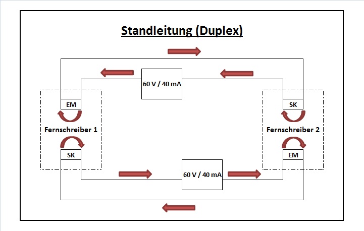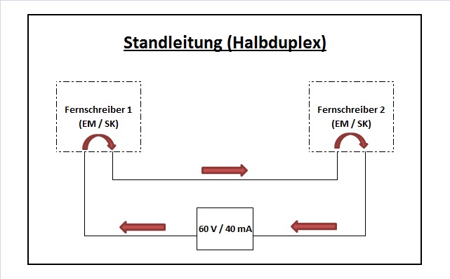 Eine solche Standleitung ermöglicht es zwischen zwei oder mehr Fernschreibern Fernschreiben zu versenden. Es ist immer nur möglich, dass ein angeschlossener Fernschreiber sendet und dies dann alle anderen Empfangen (Halbduplexbetrieb). Es ist auch möglich zwei Fernschreiber über eine 4-Draht-Leitung miteinander zu verbinden um es zu ermöglichen, dass beide angeschlossenen Fernschreiber gleichzeitig senden und empfangen können, es ist also “Gegenschreiben” möglich (Duplexbetrieb). Dazu werden jeweils die Sendekontakte des einen Fernschreibers mit dem Empfangsmagneten der anderen Maschine in Reihe Geschalten und jeweils wieder eine Spannungsquelle mit 60 V (Gleichspannung) und 40 mA integriert.